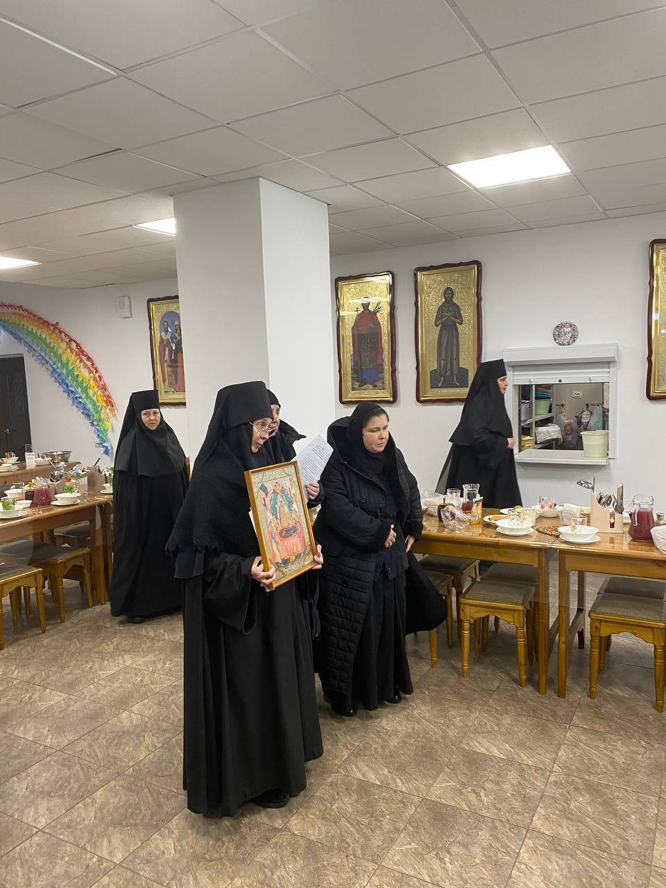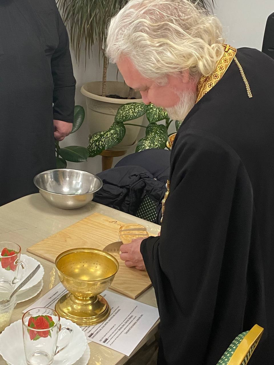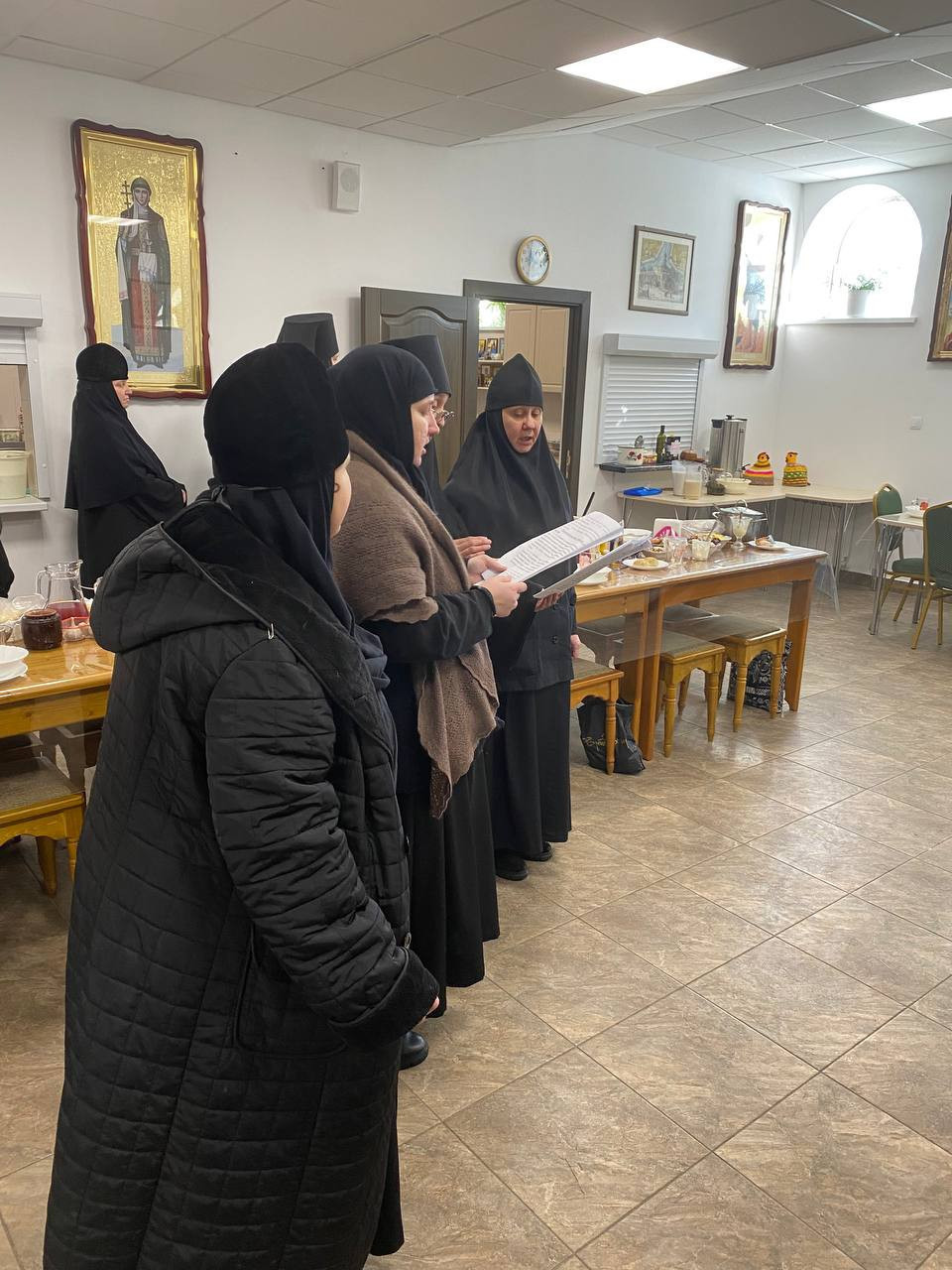 После трапезы она возносится перед иконами с прославлением Святой Троицы и с молитвой Пресвятой Богородице. По преломлении просфоры она вкушается всеми присутствующими на трапезе, тем самым создавая живое присутствие Самой Богоматери, а совместное принятие земной пищи — это продолжение богослужения и монашеского устава.